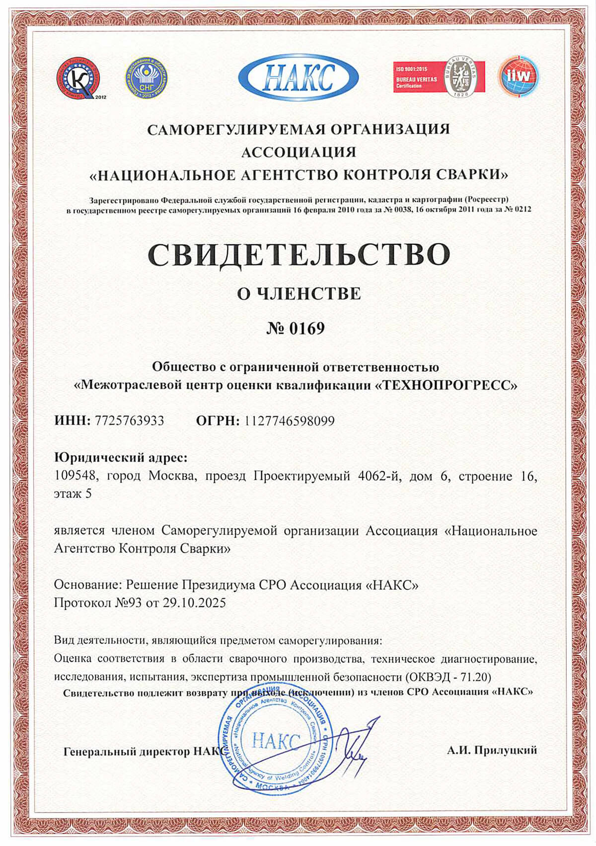 МЦОК «ТехноПрогресс» аккредитован в 9 советах по профессиональным квалификациям, является аккредитованным независимым органом по аттестации (сертификации) персонала в соответствии со СДАНК-02-2020