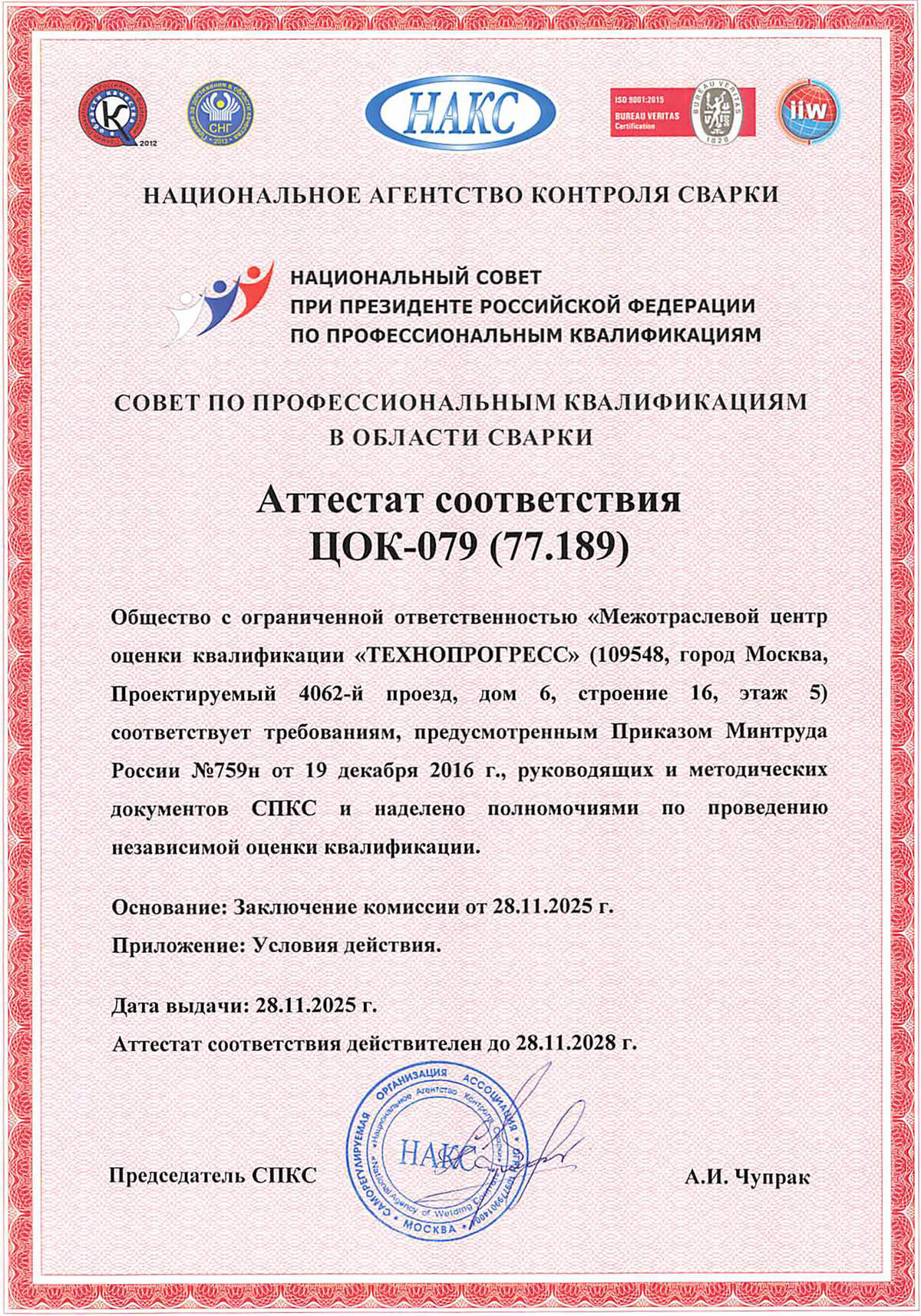 ООО МЦОК «ТехноПрогресс» аккредитован в Совете по профессиональным квалификациям в области сварки в качестве Центра по оценке профессиональных квалификаций, аттестат соответствия ЦОК № 77.189 от 28.11.2025 г.